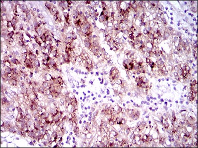 - Immunohistochemical analysis of paraffin-embedded human liver cancer tissues using FLT3 mouse mAb with DAB staining.