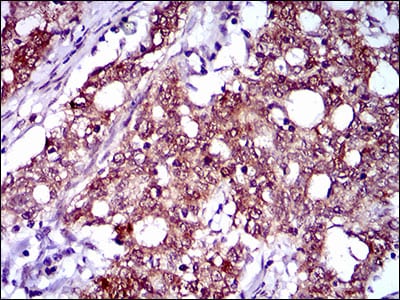 - Immunohistochemical analysis of paraffin-embedded human cervical cancer tissues using CFLAR mouse mAb with DAB staining.