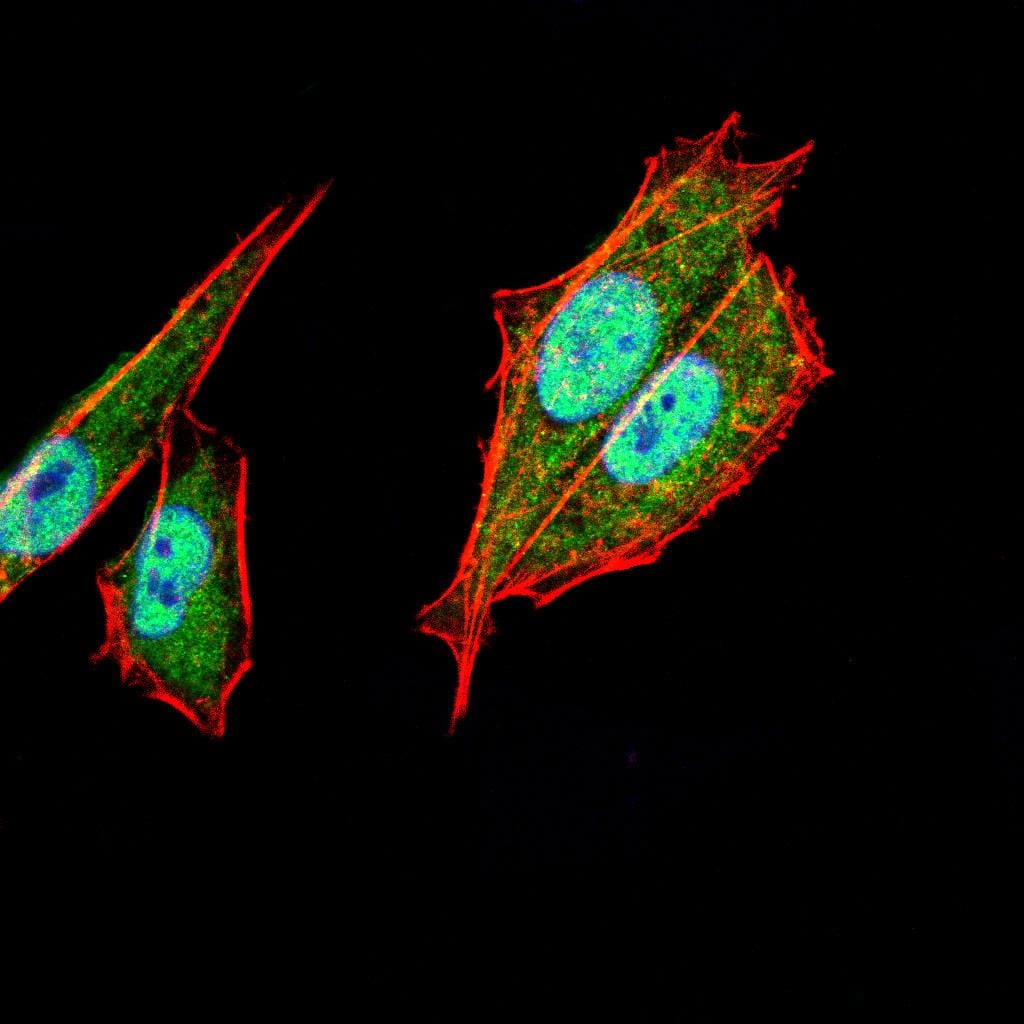 - Immunofluorescence analysis of Hela cells using TFAP2A mouse mAb (green). Blue: DRAQ5 fluorescent DNA dye. Red: Actin filaments have been labeled with Alexa Fluor- 555 phalloidin. Secondary antibody from Fisher (Cat#: 35503)