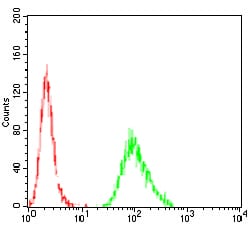 Flow cytometric analysis of *** cells using *** mouse mAb (green) and negative control (red).
