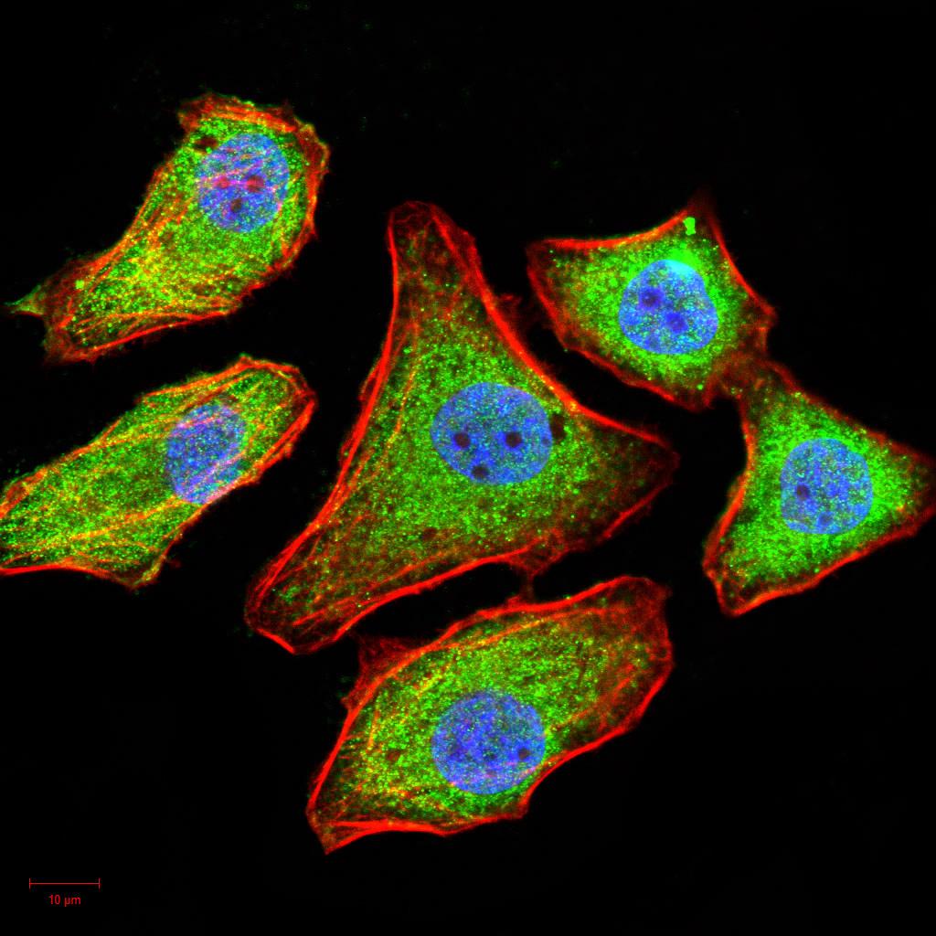 - Immunofluorescence analysis of Hela cells using SELL mouse mAb (green). Blue: DRAQ5 fluorescent DNA dye. Red: Actin filaments have been labeled with Alexa Fluor- 555 phalloidin. Secondary antibody from Fisher (Cat#: 35503)