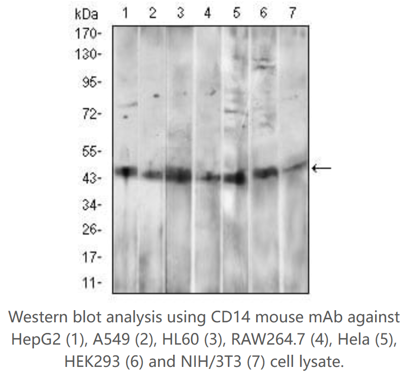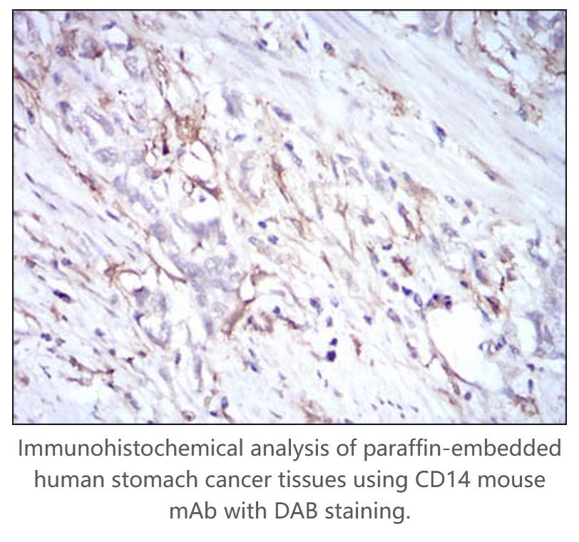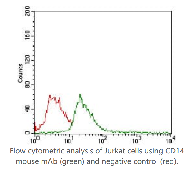 CD14是一种锚定蛋白,是一种普遍存在的模式识别受体。CD14作为细菌脂多糖LPS的细胞膜受体,它与其他蛋白质协同作用,在机体免疫、防御系统引起的一系列病理反应中起关键作用。在巨噬细胞(蛋白质水平)上能检测到该蛋白的表达,在单核细胞表面强烈表达,在粒细胞表面弱表达,大多数组织巨噬细胞表达。