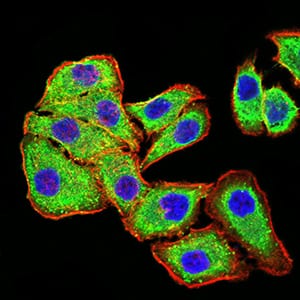 - Immunofluorescence analysis of MCF-7 cells using PLD2 mouse mAb (green). Blue: DRAQ5 fluorescent DNA dye. Red: Actin filaments have been labeled with Alexa Fluor- 555 phalloidin. Secondary antibody from Fisher (Cat#: 35503)