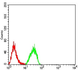 - Flow cytometric analysis of Hela cells using PLD2 mouse mAb (green) and negative control (red).