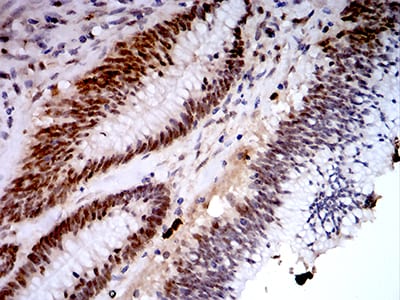 - Immunohistochemical analysis of paraffin-embedded human colon cancer tissues using KDM1A mouse mAb with DAB staining.