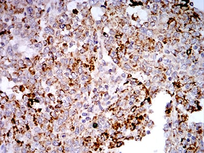 Immunohistochemical analysis of paraffin-embedded human ovarian cancer tissues using TLR9 mouse mAb with DAB staining.