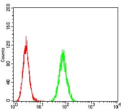 - Flow cytometric analysis of Hela cells using HTR3A mouse mAb (green) and negative control (red).