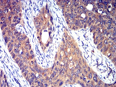 - Immunohistochemical analysis of paraffin-embedded human cervical cancer tissues using HTR3A mouse mAb with DAB staining.
