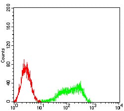 Flow cytometric analysis of HL-60 cells using CD97 mouse mAb (green) and negative control (red).