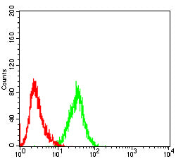Flow cytometric analysis of HEK293 cells using ULK3 mouse mAb (green) and negative control (red).
