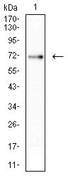 Western blot analysis using ULK3 mouse mAb against rat testis (1), PC-3 (2), DU145 (3),HEK293 (4),LNCAP (5)and Hela (6) cell lysate.