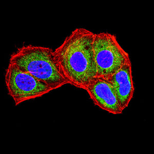 - Immunofluorescence analysis of Hela cells using IL1B mouse mAb (green). Blue: DRAQ5 fluorescent DNA dye. Red: Actin filaments have been labeled with Alexa Fluor- 555 phalloidin. Secondary antibody from Fisher (Cat#: 35503)