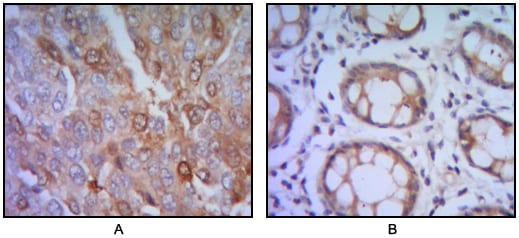 Immunohistochemical analysis of paraffin-embedded human lung cancer (A), colon cancer (B) using ST13 mouse mAb with DAB staining.