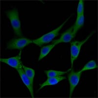 Immunofluorescence analysis of NIH/3T3 cells using ST13 mouse mAb (green). Blue: DRAQ5 fluorescent DNA dye.