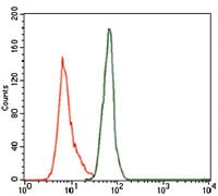 Flow cytometric analysis of MOLT4 cells using PPP1CC mouse mAb (green) and negative control (purple).