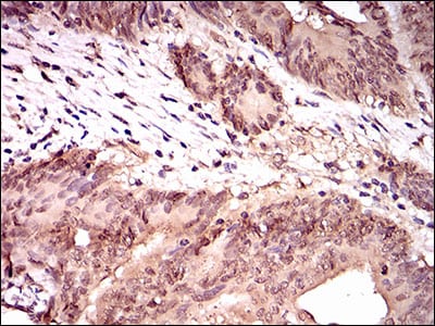Immunohistochemical analysis of paraffin-embedded human colon cancer tissues using PPP1CC mouse mAb with DAB staining.