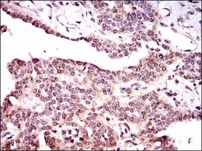 Immunohistochemical analysis of paraffin-embedded human ovarian cancer tissues using PPP1CC mouse mAb with DAB staining.