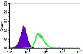 Flow cytometric analysis of HeLa cells using KIF11 mouse mAb (green) and negative control (purple).