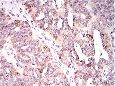 Immunohistochemical analysis of paraffin-embedded human ovarian cancer tissues using KIF11 mouse mAb with DAB staining.
