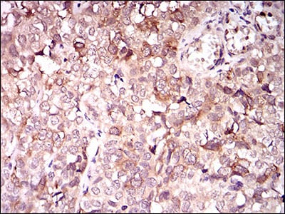 Immunohistochemical analysis of paraffin-embedded human bladder cancer tissues using KIF11 mouse mAb with DAB staining.