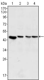 Western blot analysis using Pirh2 mouse mAb against Hela (1), A549 (2), MCF-7 (3) and PC-12 (4) cell lysate.