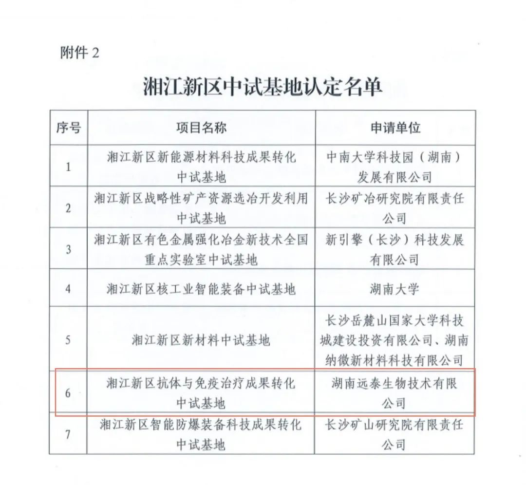 近日,岳麓山科技大学城管理委员会发布了关于认定2023年度湘江新区科技成果转化概念验证中心和中试基地的通知,远泰生物获批湘江新区抗体与免疫治疗成果转化中试基地。